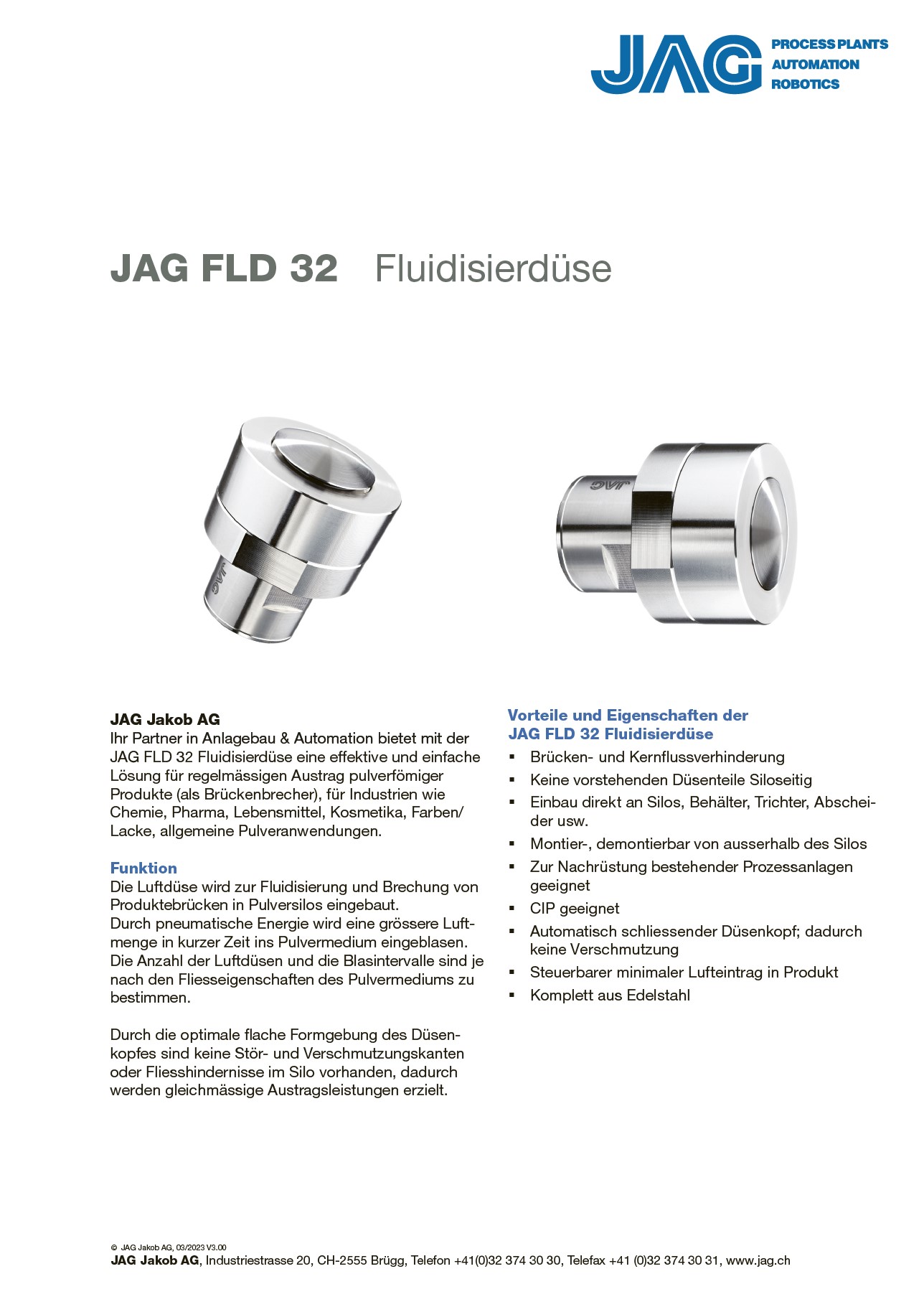 Die JAG Fluidisierdüse optimiert das Fliessverhalten pulverförmiger Stoffe beim Austrag in Silos, Behälter, Trichter, Abscheider usw. durch präzise steuerbare Luftstösse. Geeignet für sämtliche industriellen Pulveranwendungen: Chemie, Pharma, Farben, Lacke, Kosmetika, Lebensmittel.